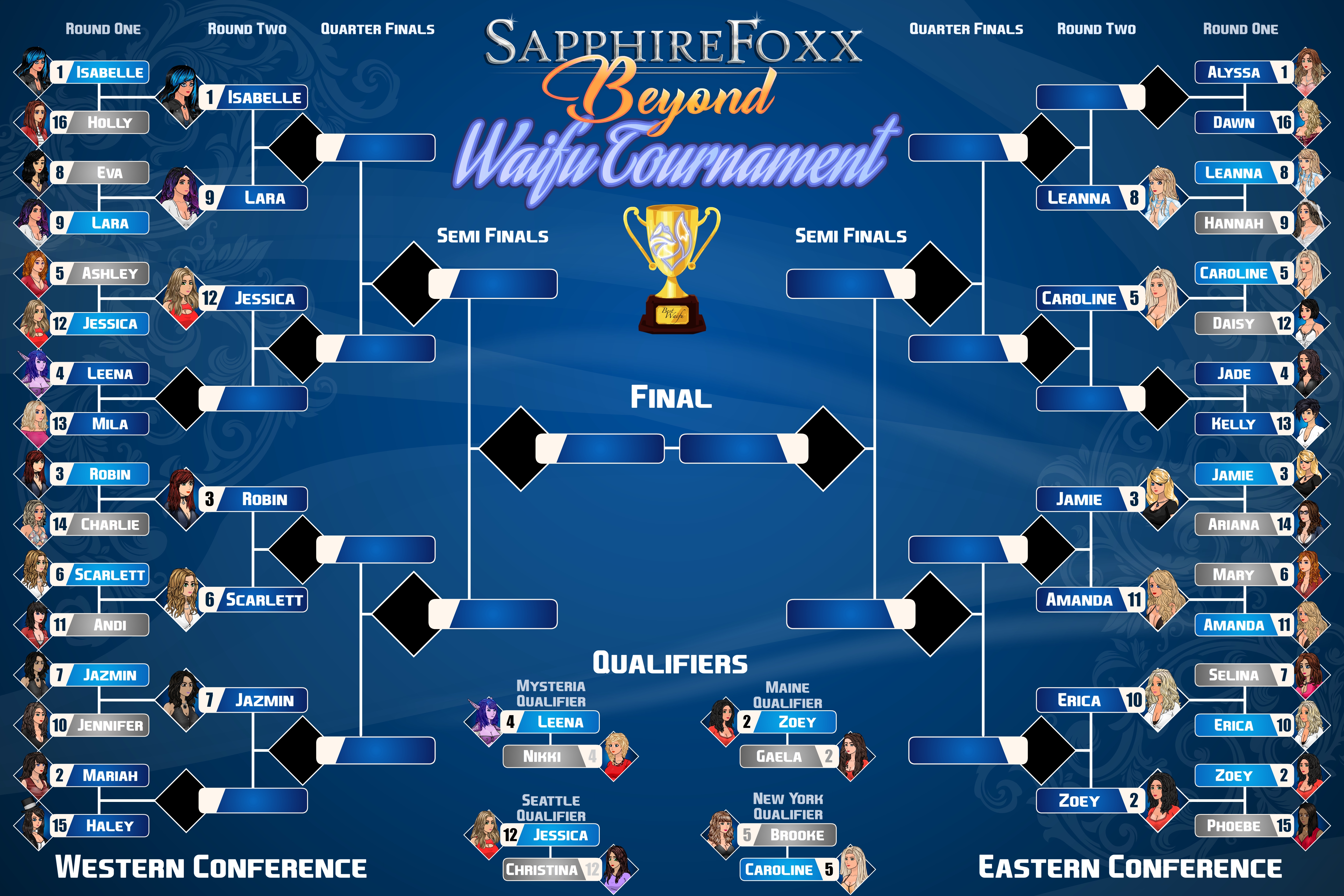 I’m looking at the bracket, and there aren’t really that many chances for upsets from older characters in the next round (most of the older characters are higher-seeded anyway next round). Maybe in the quarterfinals we could see Jamie over Zoey or something. Or mabe we could have an interesting semifinals or finals.